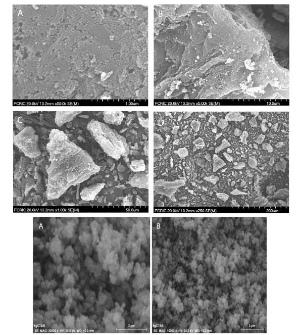 圖1呈現(xiàn)活性炭的掃描電子顯微鏡(SEM)圖像,其示出了活性炭的結(jié)構(gòu)和表面表征。圖像顯示碳顆粒的平均尺寸為約20nm,并且這些顆粒聚集在一起并形成平均尺寸為25μm的角形簇?紫堵蕿17.78%?梢钥闯龃氐谋砻媸瞧教沟,粗糙的和多孔的。最后兩幅顯示的活性炭摻雜二氧化鈦的圖像。在嚴(yán)格攪拌下,將丁醇鈦溶液加入到含有活性炭的擬均勻溶液中,可能形成二氧化鈦,其中活性炭顆粒將其裝飾。