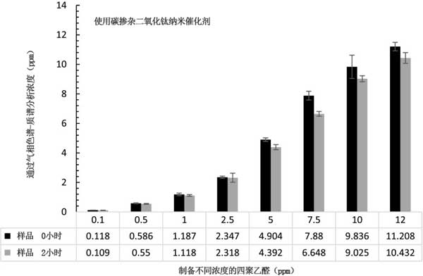 二氧化鈦摻雜的碳催化劑被認(rèn)為對(duì)水中的四聚乙醛降解無(wú)效,特別是與活性炭相比。圖3示出了前和2小時(shí)處理被碳摻雜二氧化鈦后在溶液聚乙醛的濃度2在UV-C光納米催化劑。在較高的初始濃度的金屬醛溶液如5、7.5、10和12ppm時(shí),與較低濃度的降解相比,降解稍微更顯著(2-9%)。