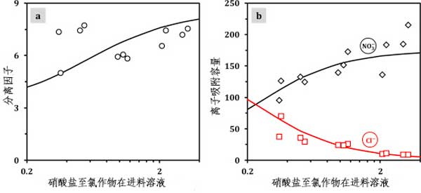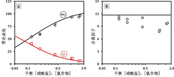 圖2a和圖2b顯示了平衡電吸附數(shù)據(jù)分離因子沒有和離子吸附容量作為的函數(shù)硝酸鹽至氯化物溶液中的濃度比。我們觀察到了平衡電吸附數(shù)據(jù)與離子吸附容量一起增加硝酸鹽至氯化物進料溶液中的濃度比。在圖2b中,我們看到隨著初始增加硝酸鹽至氯化物氯-濃度比,濃度之差硝酸鹽和氯化物在微孔中增加。然而,在達到平衡之前,優(yōu)先離子電吸附由初始濃度比確定:溶液中具有最高濃度的離子主要是電吸附的。
