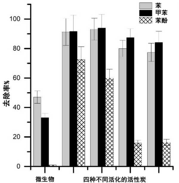 活性炭載微生物從油鹽水乳液中去除芳烴的能力如圖2所示。在與常規(guī)的氫氧化鉀活性炭被用作對照。特別是,使用常規(guī)的活性炭,苯和甲苯的吸附效率大于90%,而它們吸附苯酚的能力小于70%?梢酝ㄟ^考慮吸附物之間的極性差異來解釋這些結(jié)果。使用活性炭和載微生物活性炭的苯酚去除效率之間的比較顯示了通過微生物固定修改活性炭孔隙空間的方式。由于施氏假單胞菌消耗苯酚的能力較低,因此去除嚴(yán)格限于吸附過程。