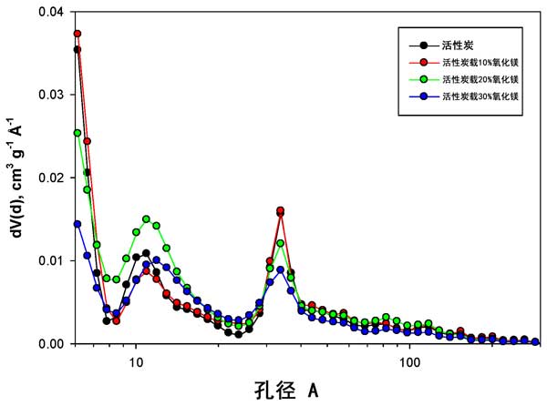 圖1:活性炭以及10、20和30wt%氧化鎂負(fù)載的活性炭的孔徑分布(PSD)。