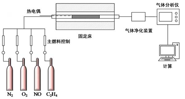 催化測(cè)試的實(shí)驗(yàn)裝置如圖1所示。將每種活性炭樣品放入固定床石英管反應(yīng)器中,該反應(yīng)器由溫控爐外部加熱。氣體流速通過質(zhì)量流控制器控制,與模擬氣體混合物調(diào)節(jié)至500ppm NO,500ppm的乙烯,3.0%(體積)Ò 2和N 2為平衡流量,總流量為1500 ml/min。在每個(gè)測(cè)試的催化劑溫度達(dá)到穩(wěn)定的設(shè)定點(diǎn)之后,將氣體混合物注入反應(yīng)器中。進(jìn)出氣中NO和NO X的濃度用煙氣分析儀分析。下標(biāo)的進(jìn)和出分別指示入口和出口的濃度。