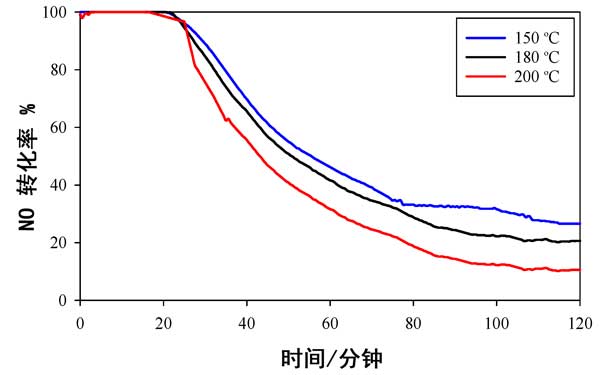 使用活性炭載錳氧化物催化劑時(shí),不同溫度下NO轉(zhuǎn)化率數(shù)據(jù)與時(shí)間的關(guān)系如圖2所示。它用于提供可以與以前發(fā)布的數(shù)據(jù)進(jìn)行比較的基線數(shù)據(jù)。在所有溫度(150°C,180°C和200°C)的前20分鐘內(nèi),幾乎有100%的NO轉(zhuǎn)化發(fā)生,但在此初始階段后NO轉(zhuǎn)化迅速下降,并且在2小時(shí)的測(cè)試后,轉(zhuǎn)化率不足20%;钚缘臏囟纫缽男砸来螢150°C>180°C>200°C。