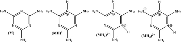 優(yōu)化了活性炭的用量和三聚氰胺溶液濃度范圍的影響,以實現(xiàn)定量分析吸附前后,以及這些研究中使用的所有活性炭中三聚氰胺的最佳條件。最初的實驗涉及不同的吸附劑劑量,以及用于吸附物檢測和定量的多種方法。通過考慮三聚氰胺在水中的溶解度(酸性和堿性條件)以及吸附實驗前后溶液中的可測量水平來選擇三聚氰胺溶液的濃度范圍。由于三聚氰胺(M)是堿,因此它可以在水溶液中經(jīng)歷幾次酸/堿平衡反應(yīng)并形成不同的質(zhì)子化物質(zhì)(見圖1)。