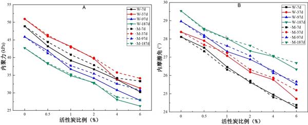 圖3:活性炭對植被混凝土的內(nèi)聚力(A)和內(nèi)摩擦角(B)的影響。