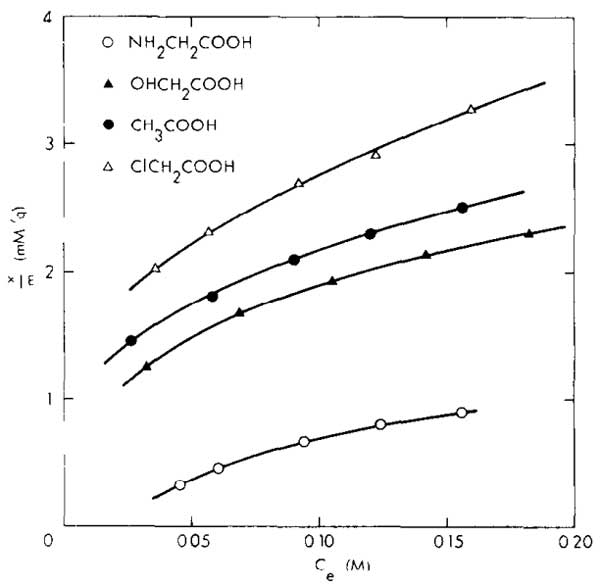 等溫線的比較表明,吸附通常以CICH,COOH>CHsCOOH>OHCH,COOH>NH,CHsCOOH的順序降低。圖1通過(guò)取代乙酸在碳原子上的吸附等溫線顯示了這一點(diǎn)。