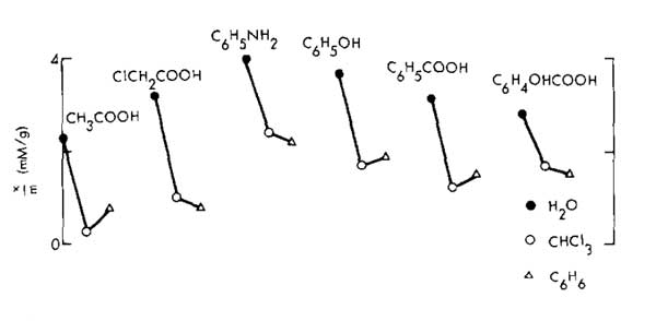通過(guò)測(cè)量水,氯仿和苯中溶液對(duì)乙酸,一氯乙酸,苯甲酸,苯酚,苯胺和水楊酸的吸附,研究了溶劑極性的影響;钚蕴康慕Y(jié)果如圖2所示。-Cl在乙酸分子中的吸附總是增加,但是在有取代苯的情況下,吸附順序是