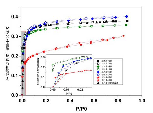 四種活性炭的吸附容量與它們的孔體積直接相關(guān),較高的孔體積導(dǎo)致較高的吸附容量。微孔活性炭對(duì)環(huán)戊烷吸附等溫線的比較清楚地表明,即使可以預(yù)料到由于顆粒大小和孔體積,顆粒大小也不會(huì)顯著影響環(huán)戊烷吸附能力。
