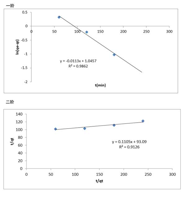 圖3:活性炭吸附柴油脫硫的一階動(dòng)力學(xué)和二階動(dòng)力學(xué)。