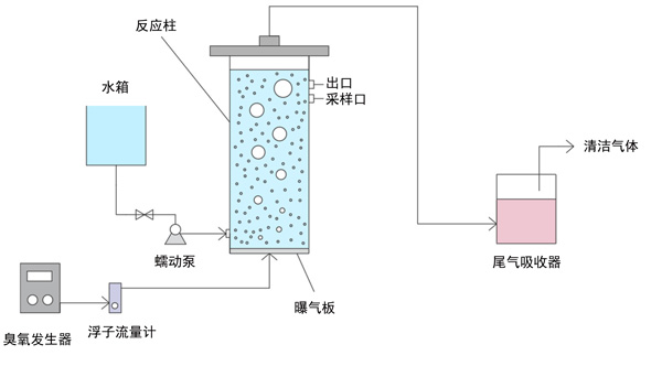 臭氧的反應(yīng)裝置如圖1所示。它主要由高硼硅酸鹽玻璃和臭氧發(fā)生器制成。反應(yīng)器高度為500mm,外徑和內(nèi)徑分別為70和65mm,有效容積為1.5L。反應(yīng)器中臭氧氣體的流量可控制在100mL分鐘以內(nèi)。反應(yīng)器中的氣體分配器是鈦板,其孔隙率約為20%至30%,微孔的平均孔徑約為17μm。臭氧反應(yīng)尾氣的吸收溶液為濃度為1.5mol/L。對(duì)色度為600的模擬水楊酸異羥肟酸廢水500mL進(jìn)行采樣,并將其放入燒杯中。將制得的活性炭量0.03、0.06、0.09、0.12、0.15和0.18g/L樣品分別添加到前一溶液中,然后用磁力攪拌器混合以達(dá)到吸附平衡,分析處理后的上清液的色度以評(píng)價(jià)處理效果。